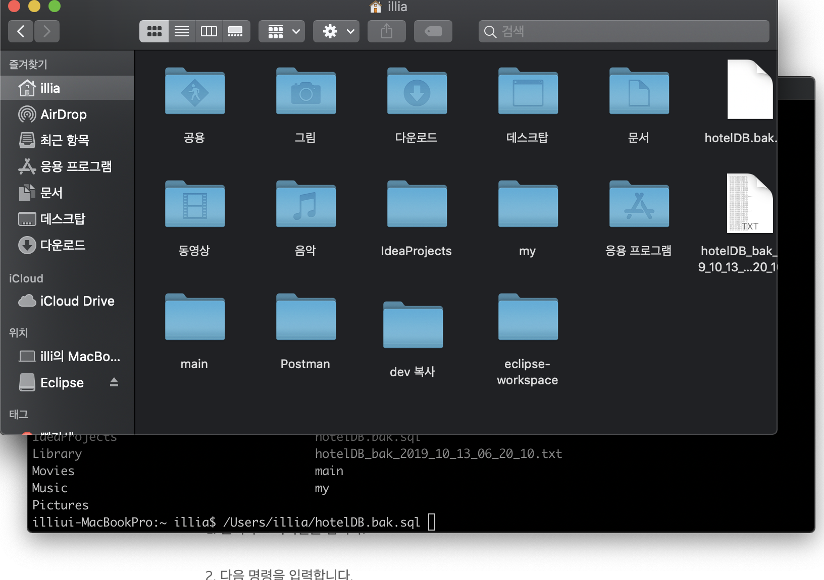 제일 처음 쳤던 ls 커맨드 결과 파일들이 저기 맥북 사용자 이름 illia 라는 디렉토리에 들어가 있다. 즉